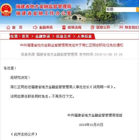 近日,福建省地方金融监督管理局官网发布了《中共福建省地方金融监督管理局党组关于蒋仁正同志职务任免的通知》。