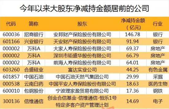 具体来看,招商银行大股东“安邦财产保险股份有限公司“公告拟减持金额高达146.78亿元,成为年内规模最大的一笔减持。此外,兴业银行大股东“天安财产保险股份有限公司”拟减持金额超90亿元;万科A股东安邦保险及宝能系大股东合计拟减持金额超200亿。另外,中国石油、云南白药、信维通信等股拟减持金额均超过10亿元。