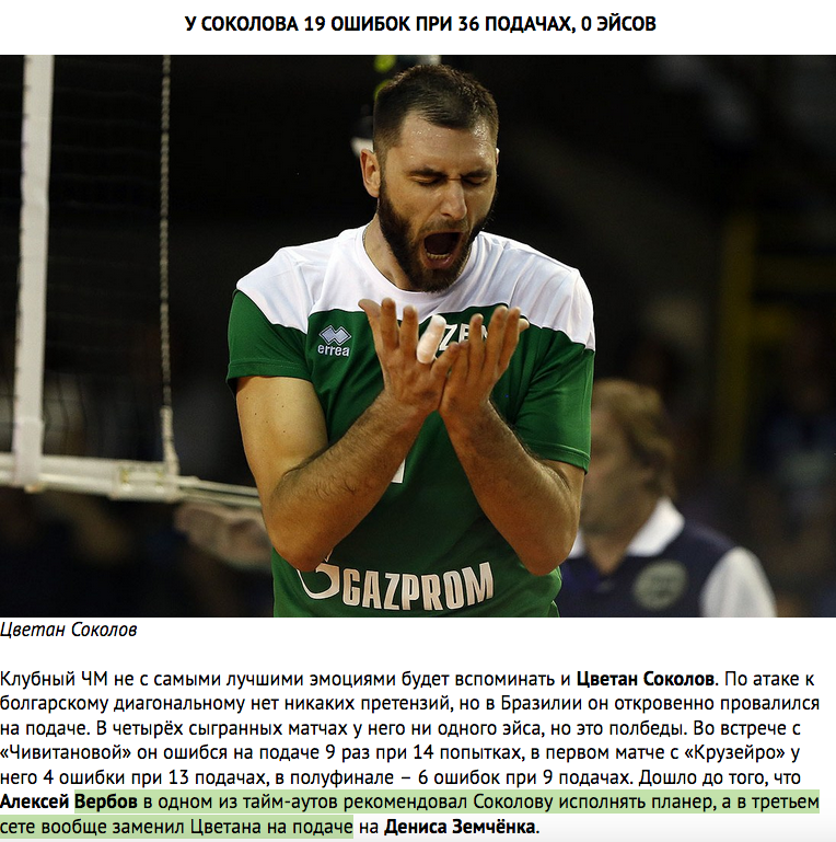 Една от най-авторитетните медии пишещи за волейбол в Русия ”БИЗНЕС Online” не спести пропуските на родни диагонал най-вече за представянето му на световното клубно първенство в Бетим (Бразилия).
