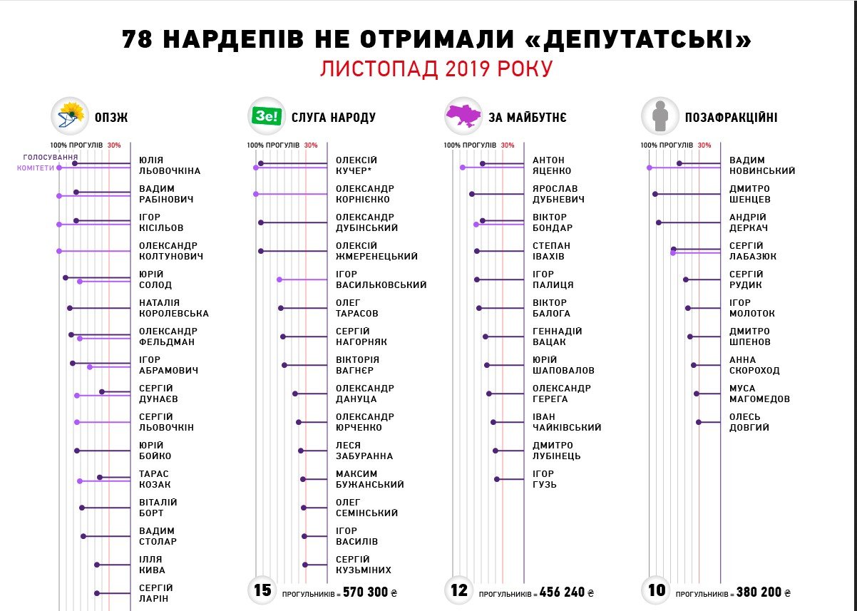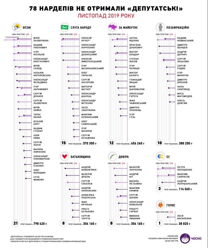 Но в Раде всё так быстро меняется. В декабре «Чесно» запросил информацию по ноябрю и выяснил, что 78 нардепов попали под санкции нового закона и им не выплатили три миллиона гривен «депутатских». В январе «Чесно» запросил информацию за декабрь. И оказалось, что в декабре среди нардепов уже не было ни одного прогульщика-лишенца! Главное организационное управление аппарата ВРУ сообщило, что в декабре все народные депутаты получили «депутатские выплаты».