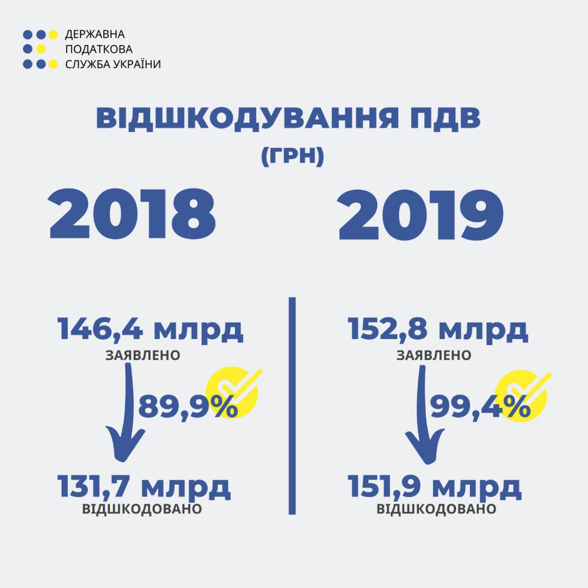 У Державній податковій службі також підкреслили, що якщо у 2018 році було відшкодовано лише 89,9% від заявлених 146,4 млрд грн, то у 2019 році – аж 99,4% від 152,8 млрд грн.
