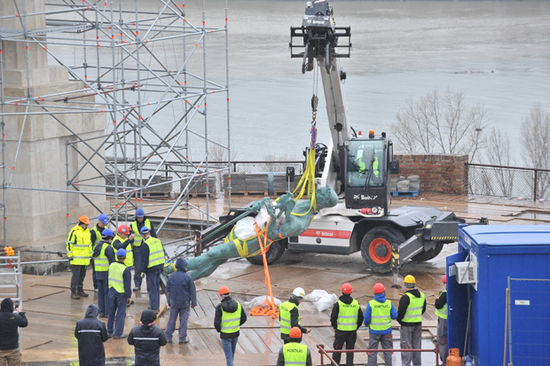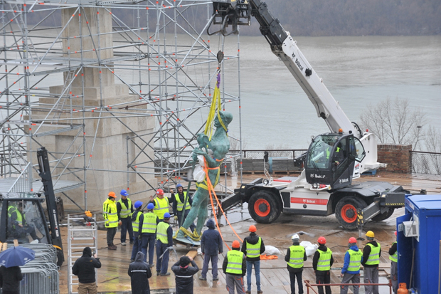 by Novosti Online/ M.S.Za vraćanje "Pobednika" na postolje bila je angažovana specijalna kran dizalica
