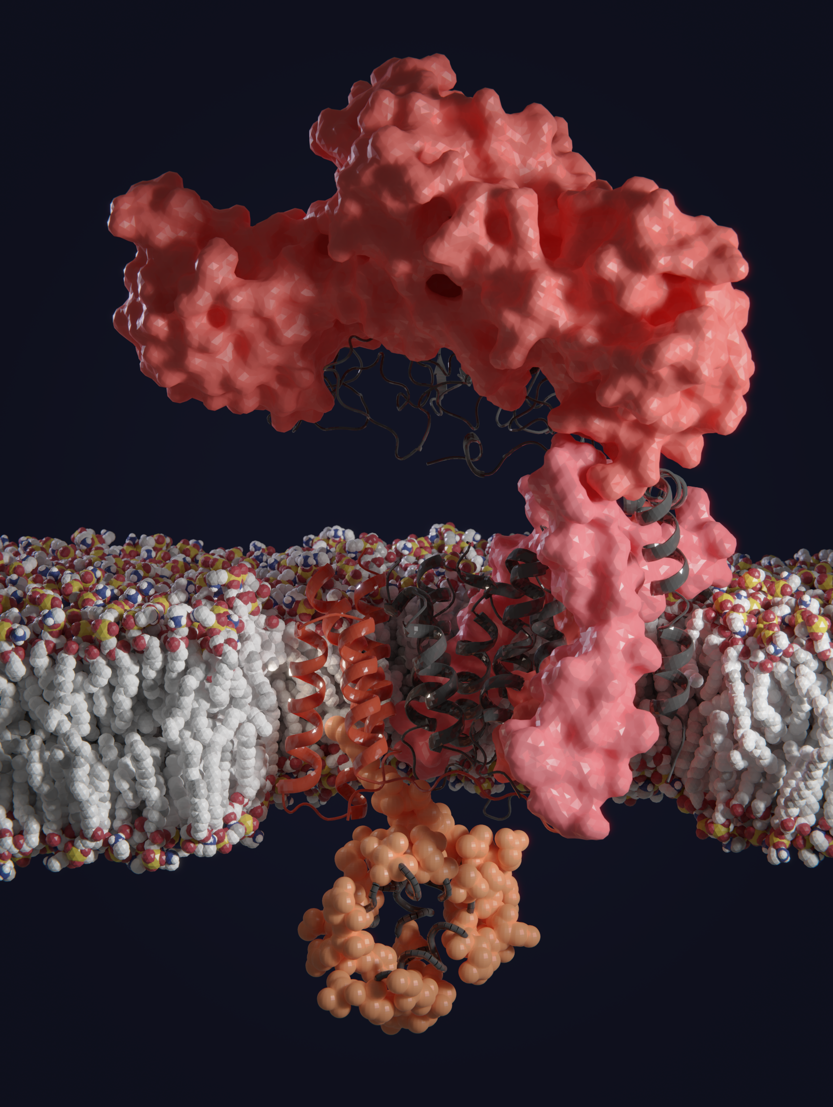 Por agora, esta história está contada numa imagem artística na capa da Molecular Cell. A imagem, que representa as partes visualizadas neste trabalho, foi feita por um antigo estudante de doutoramento do ITQB, Davide Cruz, que trabalhava na área da bioinformática. Olhemos para a imagem e vejamos o que significam as várias partes: as bolinhas (brancas, vermelhas ou azuis) representam a membrana da célula da Mycobacterium tuberculosis; as hélices cor de laranja interagem com a proteína transportadora de grupos acilo (esferas cor de laranja claro); e parte da proteína AftD está a rosa.