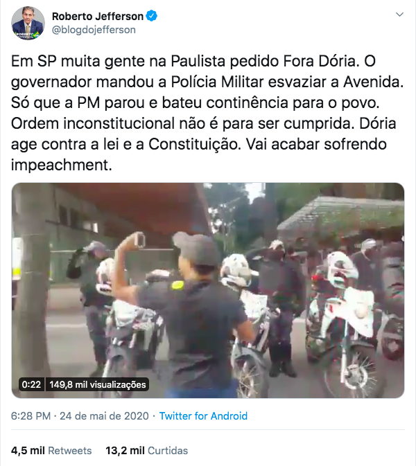 “A PM de São Paulo, parabéns para vocês. Ordem absurda não se cumpre”, falou.