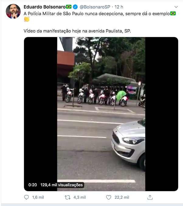 Eduardo Bolsonaro e o novo aliado do bando, Roberto Jefferson, espalharam a fake news de que PMs bateram continência para bolsonarista que faziam protesto na Paulista.