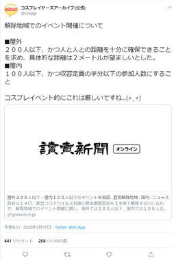 これを受けて、アニメや漫画のキャラクターの仮想を楽しむ「コスプレ」専門のSNS「コスプレイヤーズアーカイブ」は室内外の上限人数について引用し、