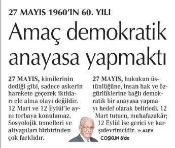 Cumhuriyet Gazetesi yazarı Alev Coşkun, "60. YIL: 27 Mayıs ve 1961 Anayasası" adlı köşe yazısında 1960 darbesinin diğer darbelerle bir olmadığını belirterek bunun bir demokrasi çabası olduğunu iddia etti. "27 Mayıs, 12 Mart, 12 Eylül ile aynı torbaya konulamaz" diyen Coşkun, yazısında "27 Mayıs, rayından çıkan demokratik sistemi yeniden doğru yola getirmek için hukukun üstünlüğü, insan hak ve özgürlüklerine bağlı çağdaş ve demokratik bir anayasa yapmayı hedef olarak belirledi. " şeklinde skandal ifadeler kullandı.