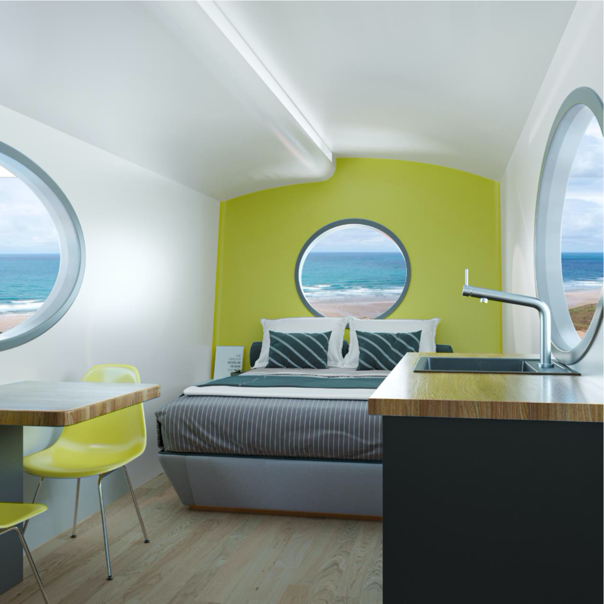 Внешний вид проекта определён влиянием элементов яхтенного дизайна. Окна, схожие по форме с иллюминаторами, максимальное исключение острых углов, округлая крыша. Внутреннее пространство определяется двумя типовыми вариантами планировки на два и четыре человека.