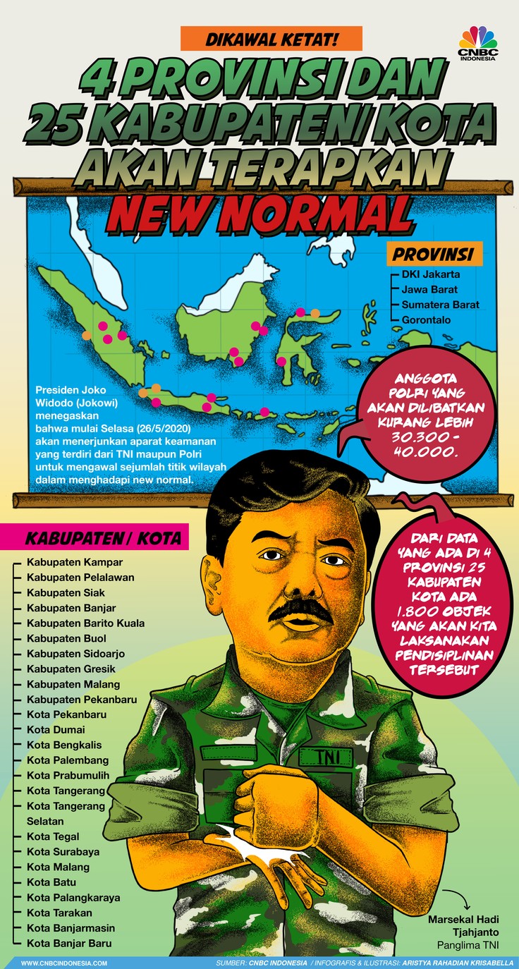 by Muhammad Iqbal & Aristya Rahadian, CNBC IndonesiaJakarta, CNBC Indonesia - Presiden Joko Widodo (Jokowi) menegaskan bahwa mulai Selasa (26/5/2020), pemerintah akan menerjunkan aparat keamanan yang terdiri dari TNI maupun Polri untuk mengawal sejumlah titik wilayah dalam menghadapi new normal.