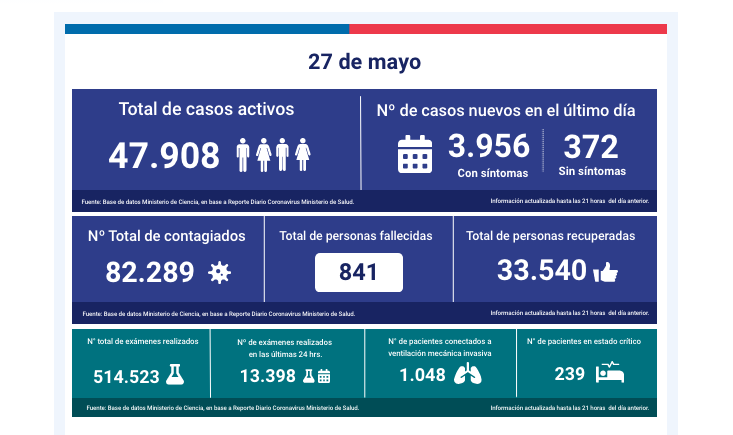 by María Ignacia InostrozaEste martes 27 de mayo, las autoridades del Minsal entregaron un nuevo balance sobre la situación Covid-19 en el país.