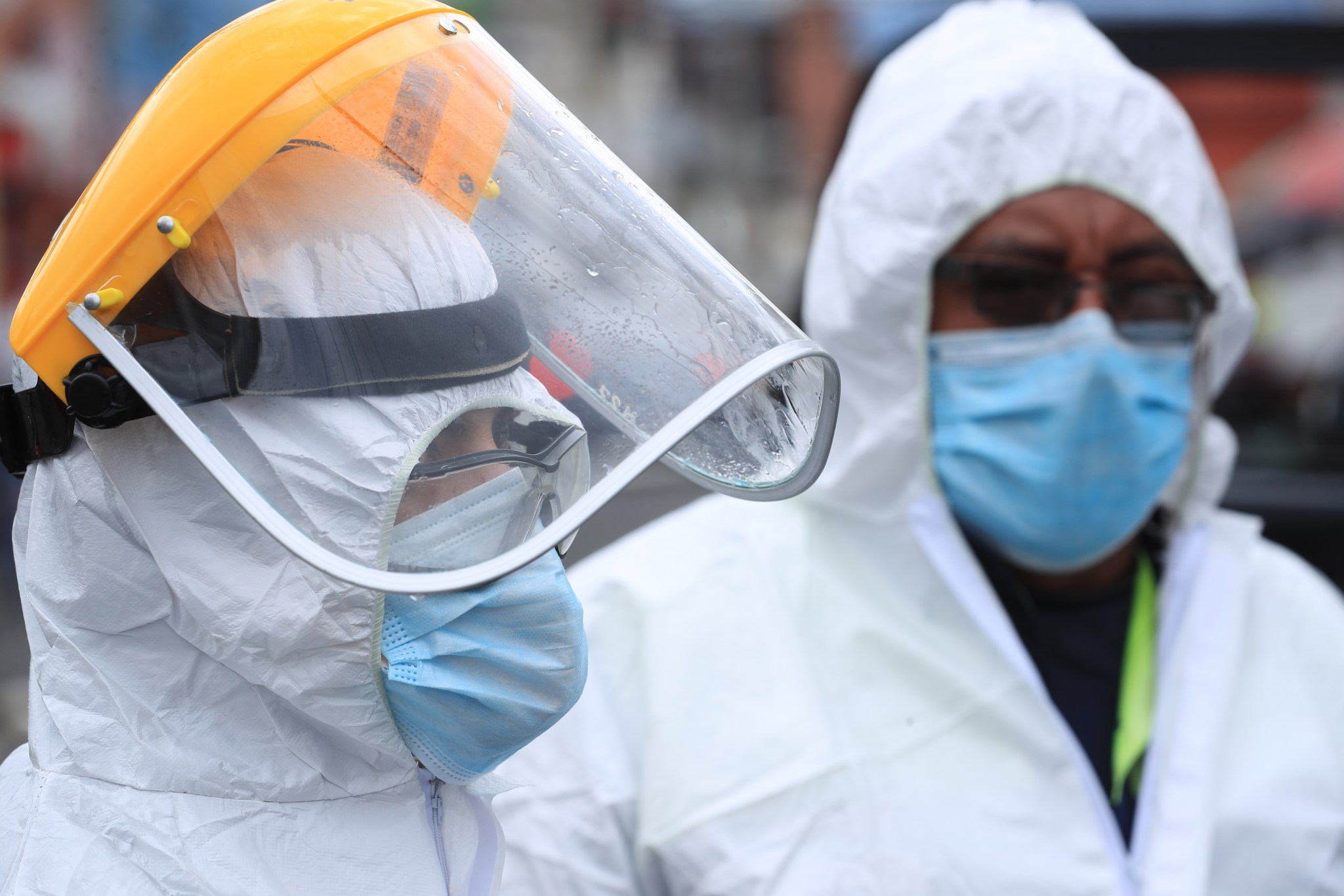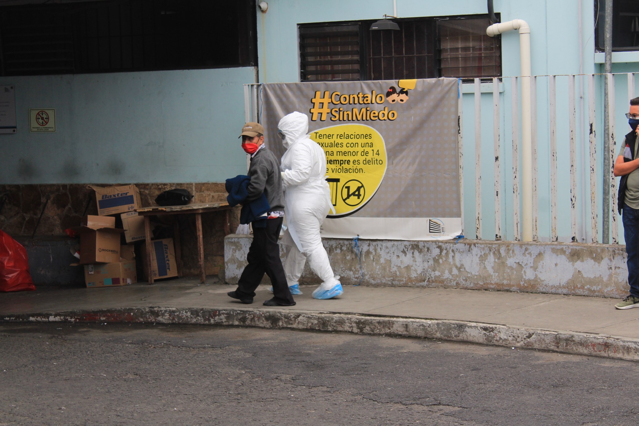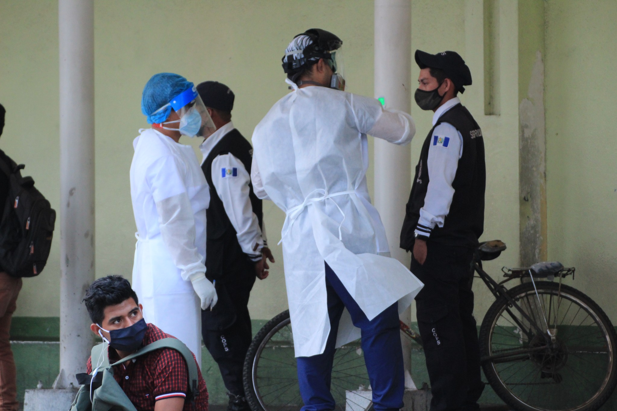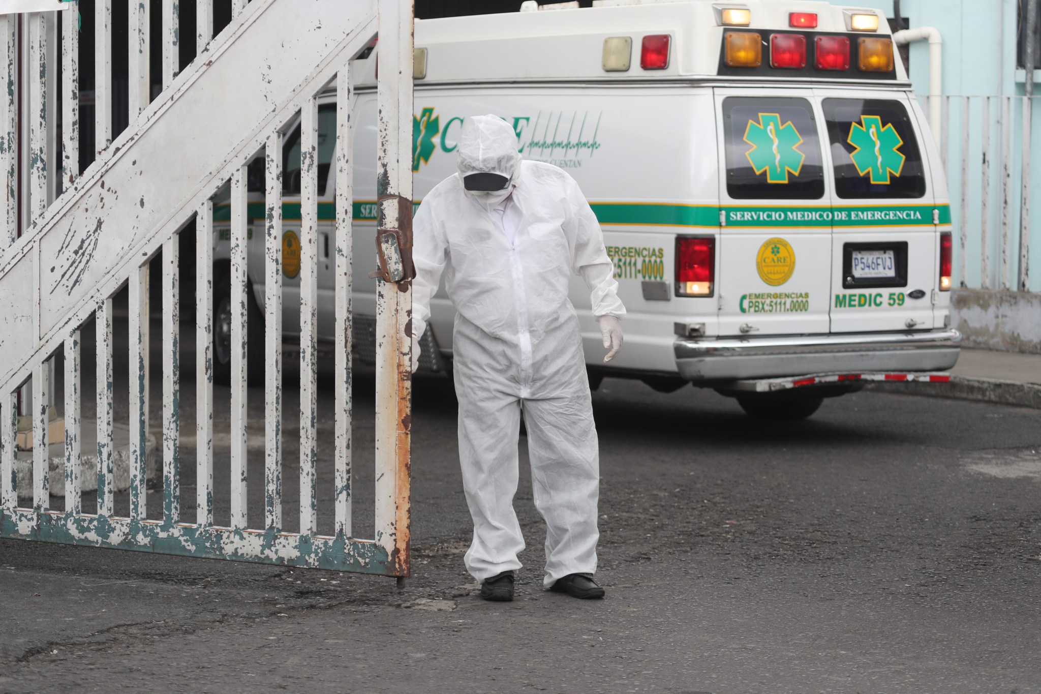 Personal médico que sale por un momento a los alrededores de hospitales lleva consigo un traje especial para evitar contacto con las personas. Al ingresar usan otro traje. Foto Prensa Libre: Juan Diego González